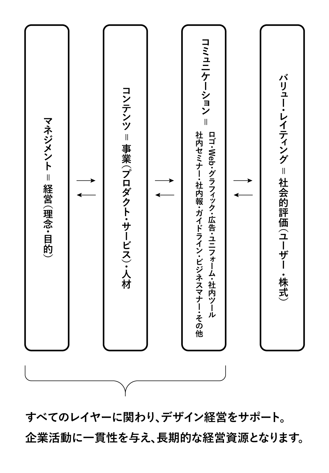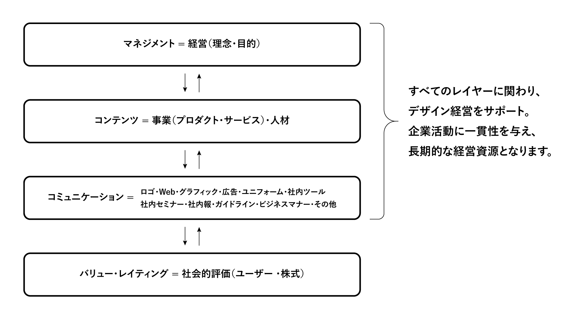 サンポノでは、ブランディングデザインの考え方を持って、マネジメント〜コンテンツ〜コミュニケーションに至るすべての領域に関わっております。2018年に経産省から発表された『「デザイン経営」宣言』に示されているように、デザイン経営によるブランディングは、企業活動に一貫性を与え、競合との差別化を図れ、長期的な経営資源となります。